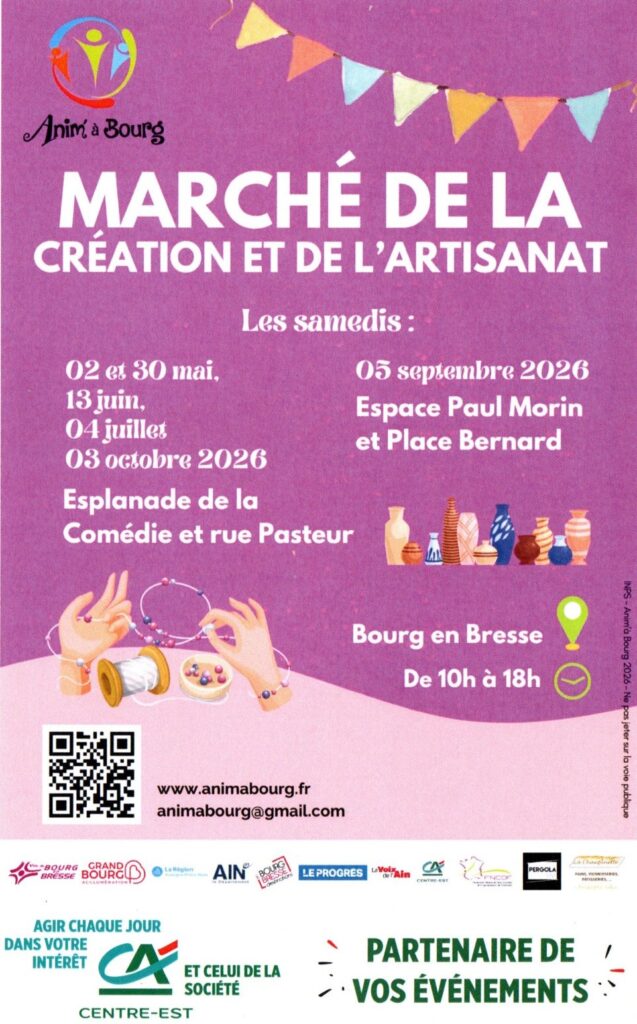 Depuis plus de 10 ans maintenant, des Marchés de la Création et de l’Artisanat sont organisés par notre association au centre ville de Bourg-en-Bresse de mai à octobre (sauf en août). Ils ont lieu en plein air sur l’esplanade de la Comédie, cours de Verdun.